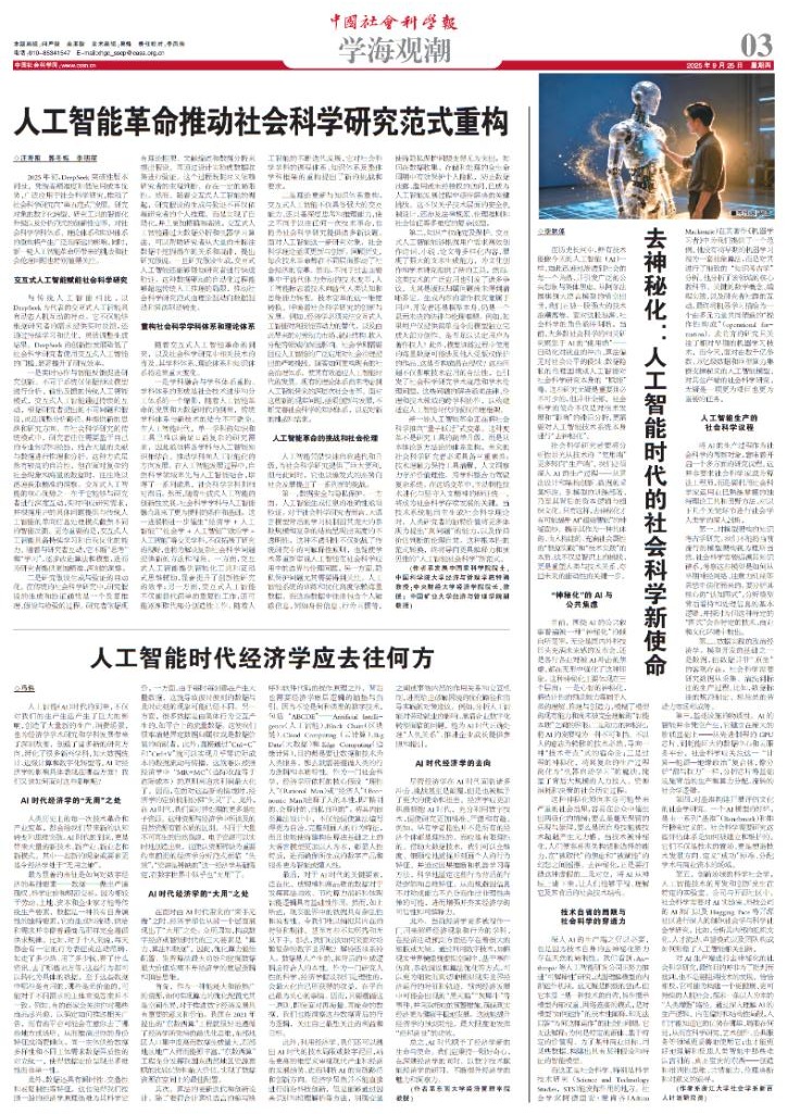 2025年初,DeepSeek突破性版本问世,凭借高精准度和低使用成本优势,广泛应用于社会科学研究,推动了社会科学研究向“第五范式”发展。研究对象的数字化转型、研究工具的智能化升级以及分析范式的创新性变革,对社会科学学科体系、理论体系和知识体系的重构将产生广泛而深远的影响。同时,新一轮人工智能革命所带来的挑战和社会伦理问题也特别值得关注。