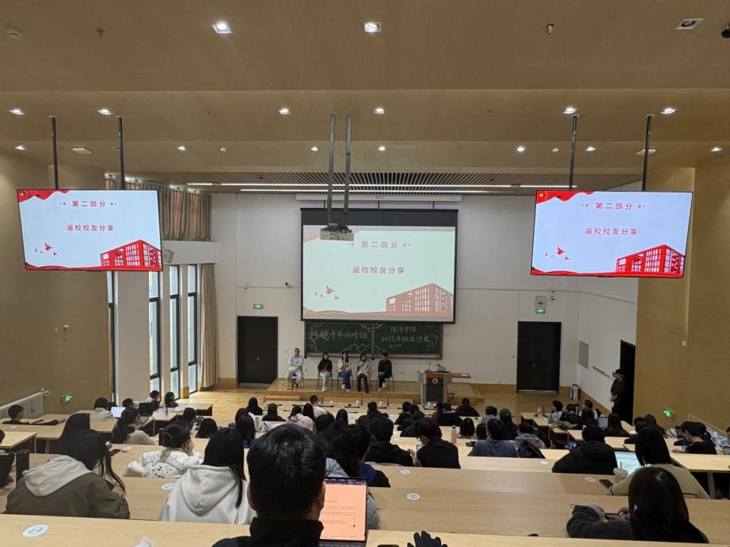 在随后的返校校友分享环节中,五位校友就毕业十年间所从事的行业领域、职业路径以及经验进行总结分享。他们来自不同的行业岗位,却都带着对母校的感激和对学弟学妹的关怀,坦诚分享了各自的奋斗故事与心路历程。互动环节中,同学们围绕职业规划、学业发展、能力提升等踊跃提问,校友们结合自身经验一一回应,建议同学们关注新兴领域,以行动专注当下、勇敢破局。