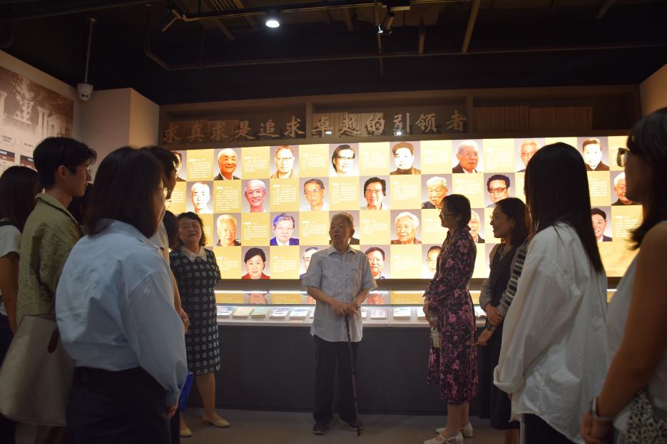 活动伊始,师生一行参观了新布展的校史陈列。通过观看馆内陈列的历史照片、文献与实物,侯教授细致讲述学校自建校、复校到蓬勃发展的整体历程。他重点讲述了早期办学的艰苦条件,以及在上级领导的关怀与老一辈教职工的不懈努力下,学校逐步克服困难、走上正轨的过程。他还结合财政、金融、会计等传统学科的发展,回顾了学科建设与人才引进的重要举措,以及学校跻身“211工程”的背景和意义。